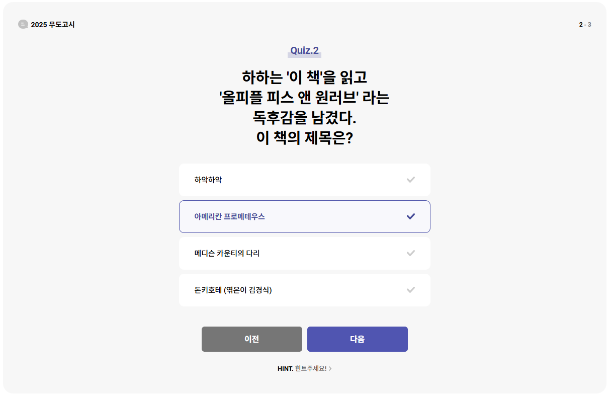 3. 3가지 문제를 맞추고 참여 완료 댓글을 작성하면 참여가 완료 되며 무도를 사랑하는 마음을 가장 잘 표현해주신 분께 무한도서 도서 패키지(3권)을 선물로 드립니다.