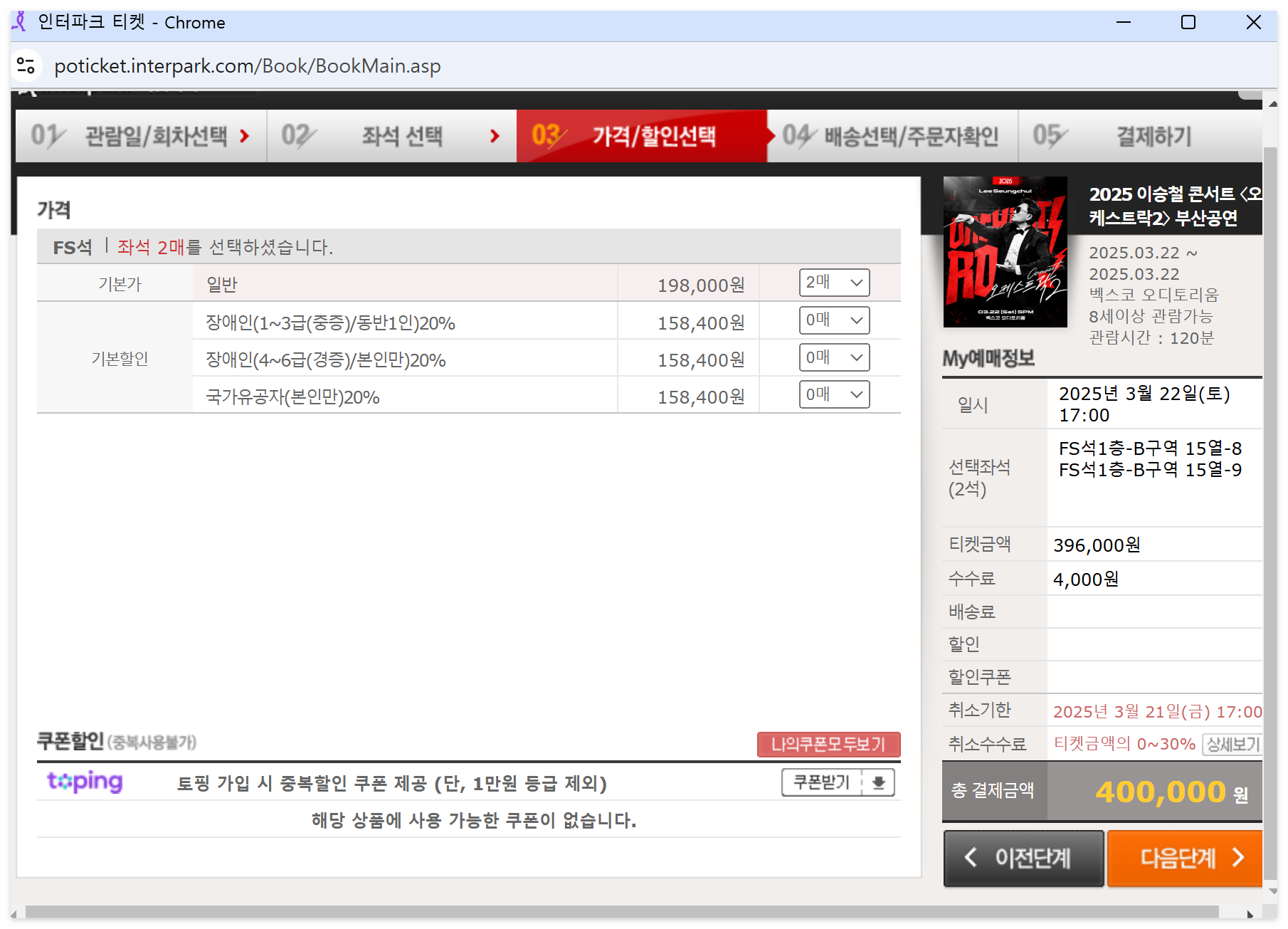 티켓수령방법(현장수령, 배송) 선택 및 예매자 확인 정보 입력 후 다음단계 클릭