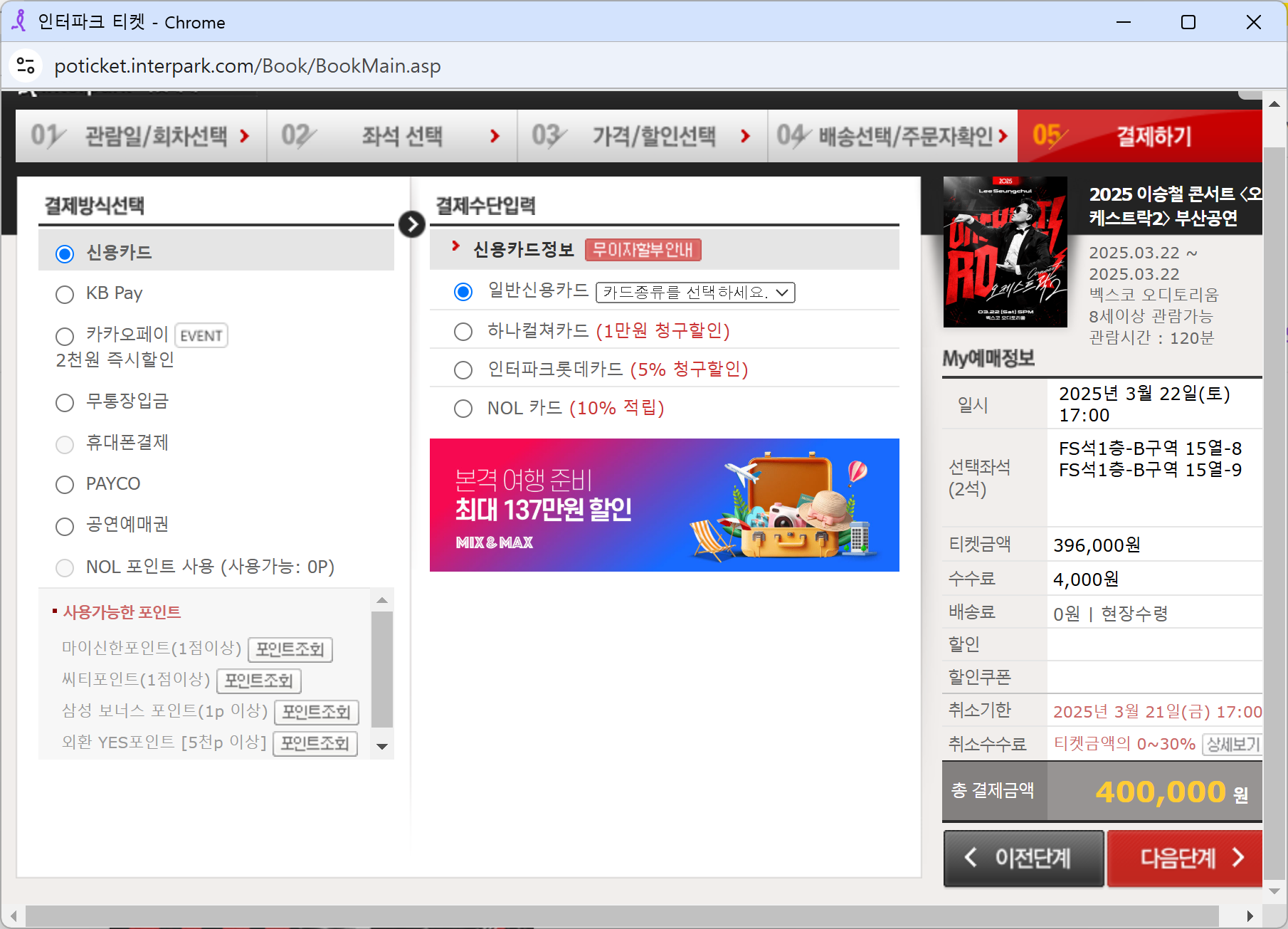 결제방법 선택 후 다음단계를 클릭하여 결제시 예매 완료